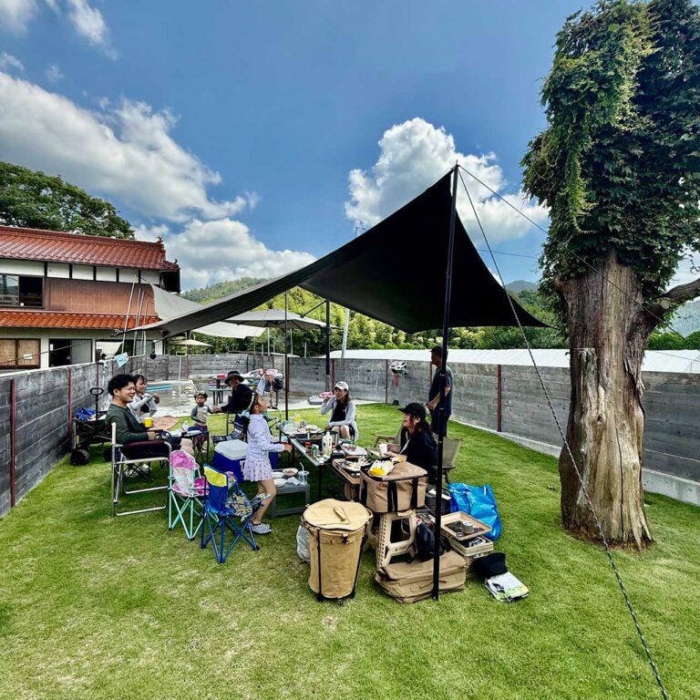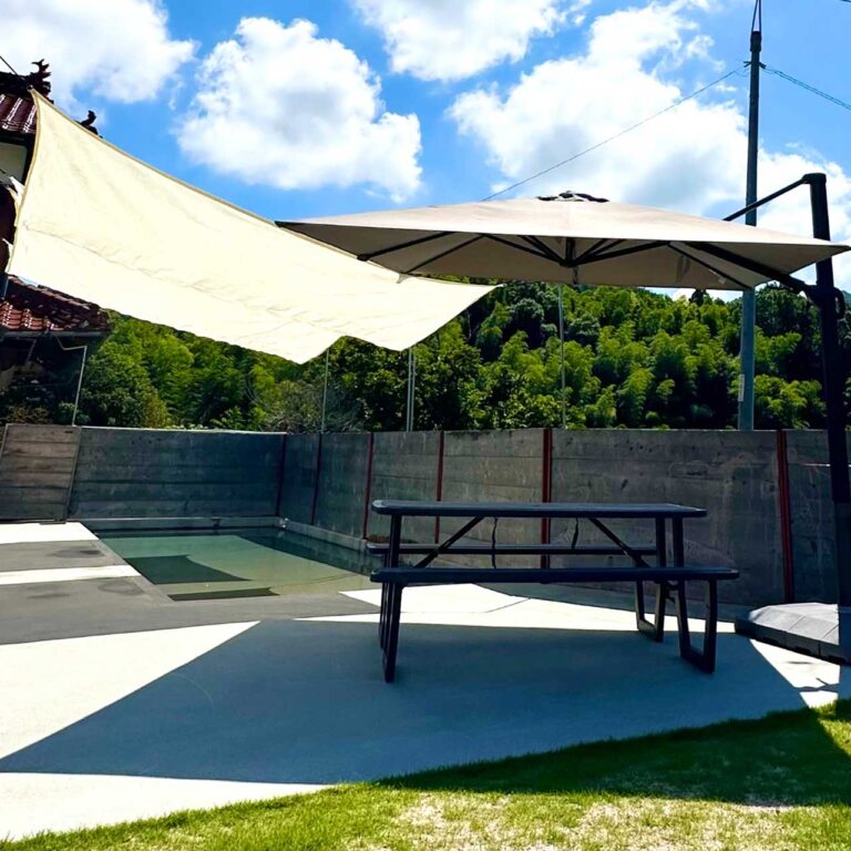 スロープ状のプールに日除オーニング+大型パラソル+6人掛けベンチテーブルもSET。ご家族でゆったりと、お友達とシェアでも、グループやオフ会、イベントにも完全貸切でお楽しみください。